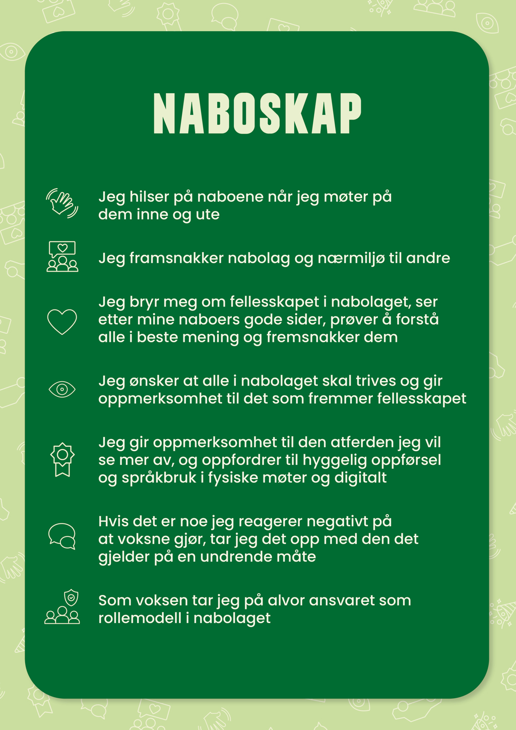 - Jeg ønsker at alle i nabolaget skal trives og gir oppmerksomhet til det som fremmer fellesskapet